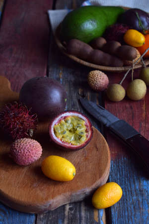 パッションフルーツ クムクワット ライチ ランブータン タマリンド アボカド ココナッツ 木製の背景にドラゴンアイと熟したトロピカルフルーツのミックス スーパーフードの背景 ベジタリアン料理 の写真素材 画像素材 Image